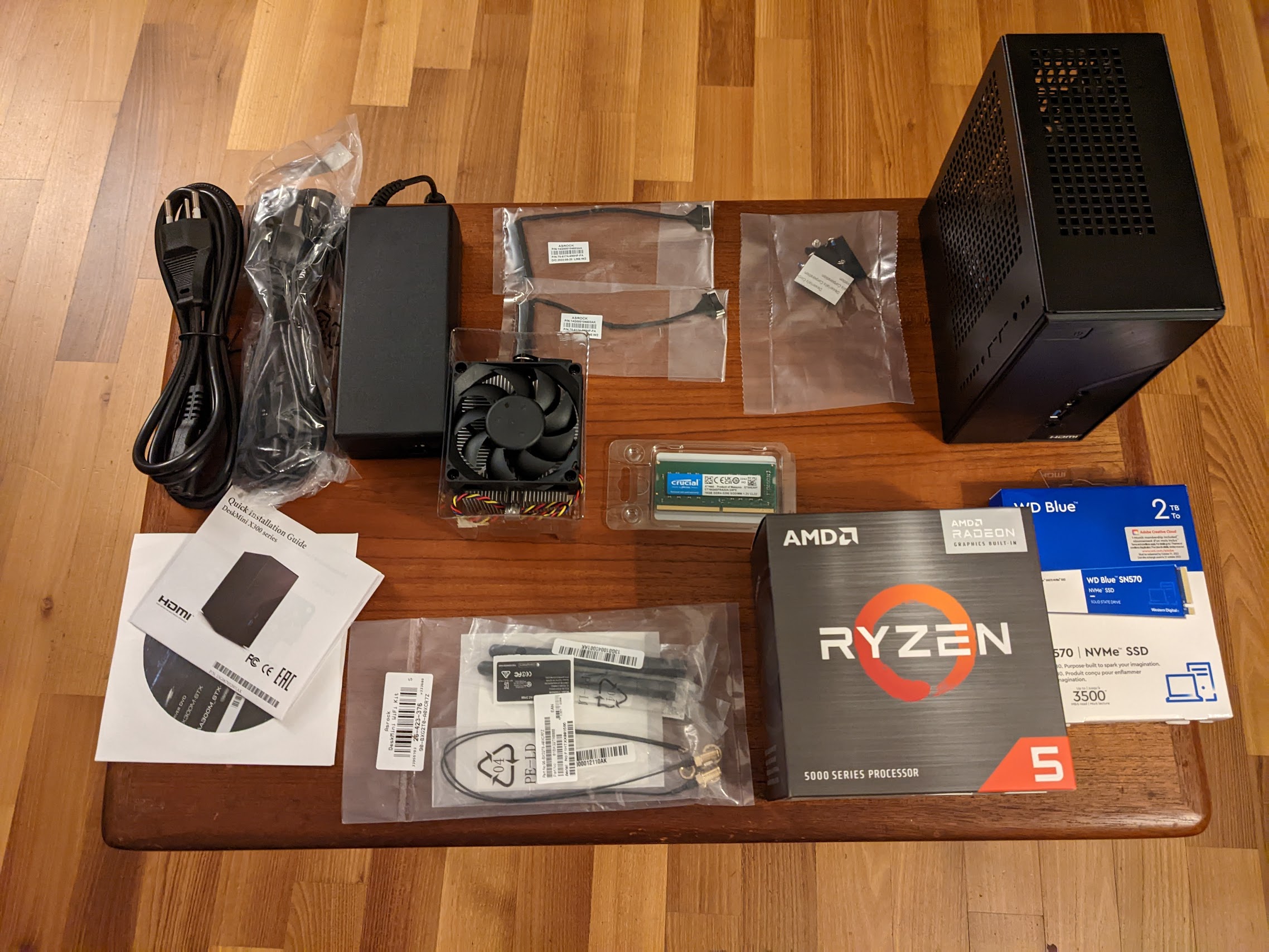 Here are all the parts I bought and their prices: | Part | Date of Purchase | Price | :— | :————— | —-: | CPU: AMD Ryzen 5 5600G | 2022-11-22 | CHF 138 | RAM: Crucial Laptop Memory, SO-DIMM, DDR4, 32 GB (2x16GB), 3200MHz | 2022-11-22 | CHF 100.30 | SSD: WD Blue SN570 (2000 GB, M.2 2280) | 2022-11-22 | CHF 139 | WiFi: ASRock DeskMini WiFi Kit | 2022-11-22 | CHF 27.90 | Cooler: Noctua NH-L9a-AM4 | 2022-11-22 | CHF 52.80 | Case + Power + Motherboard: AsRock Deskmini X300 | 2022-11-22 | CHF 168 | Total | | CHF 626