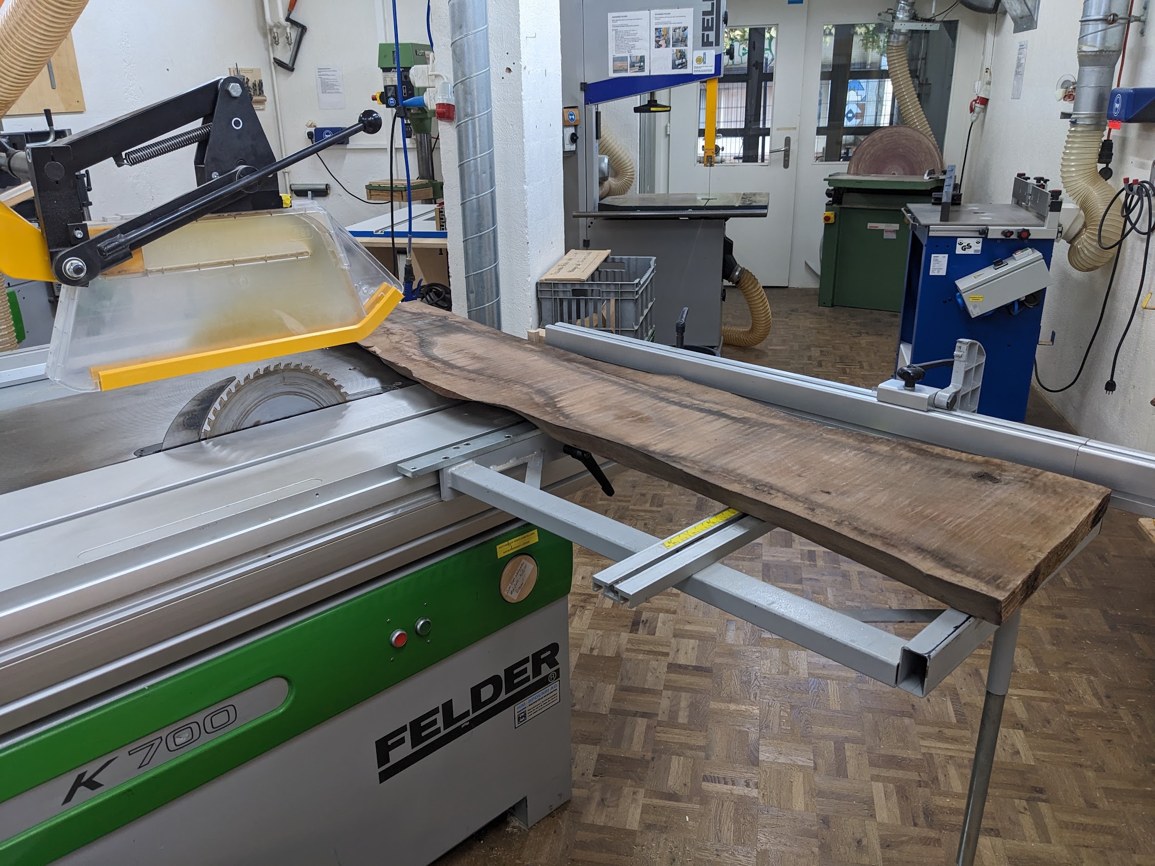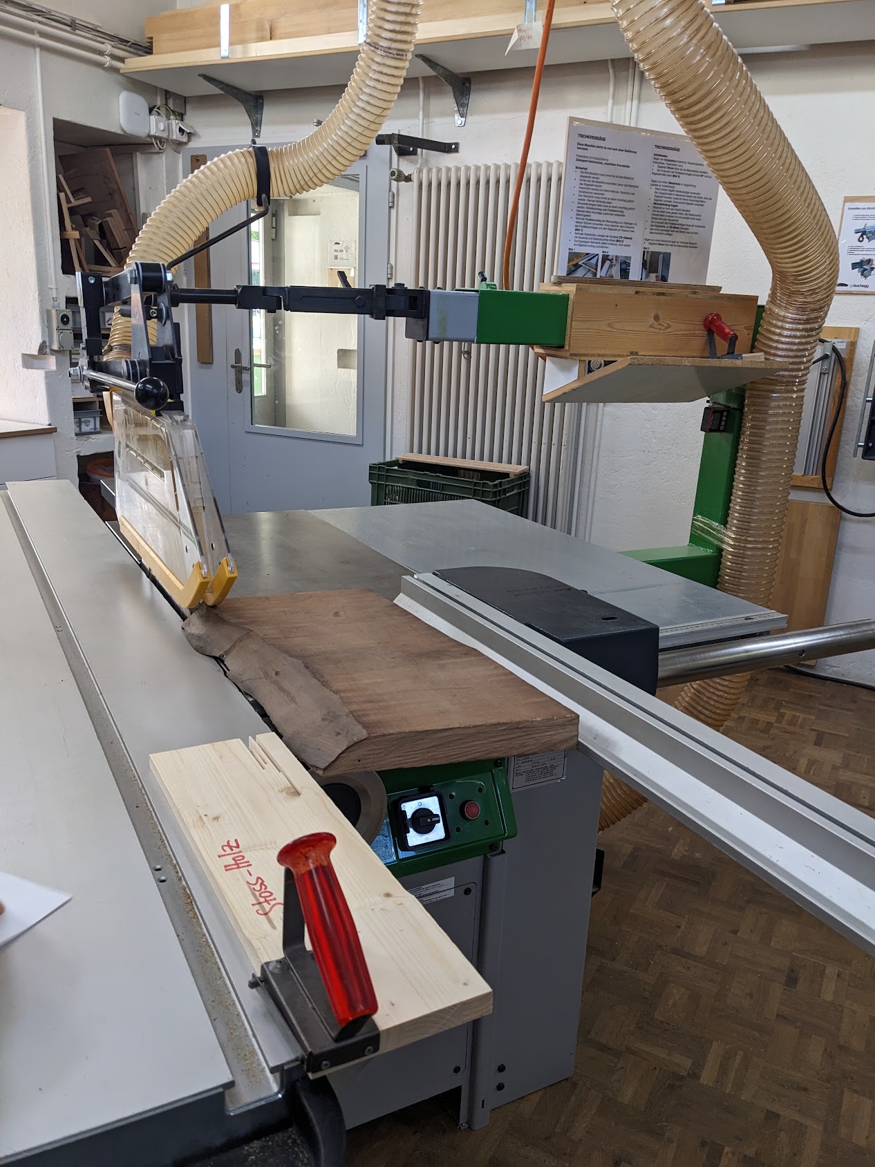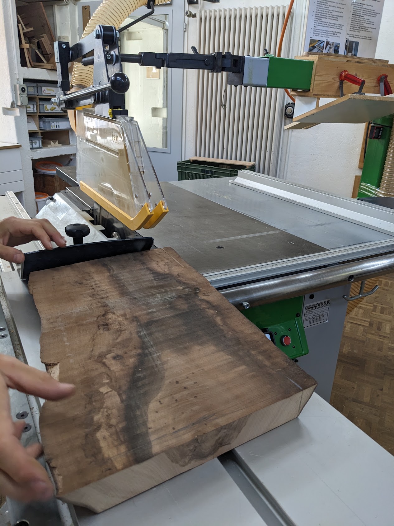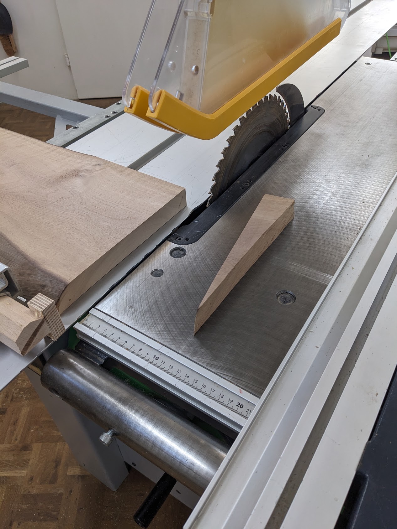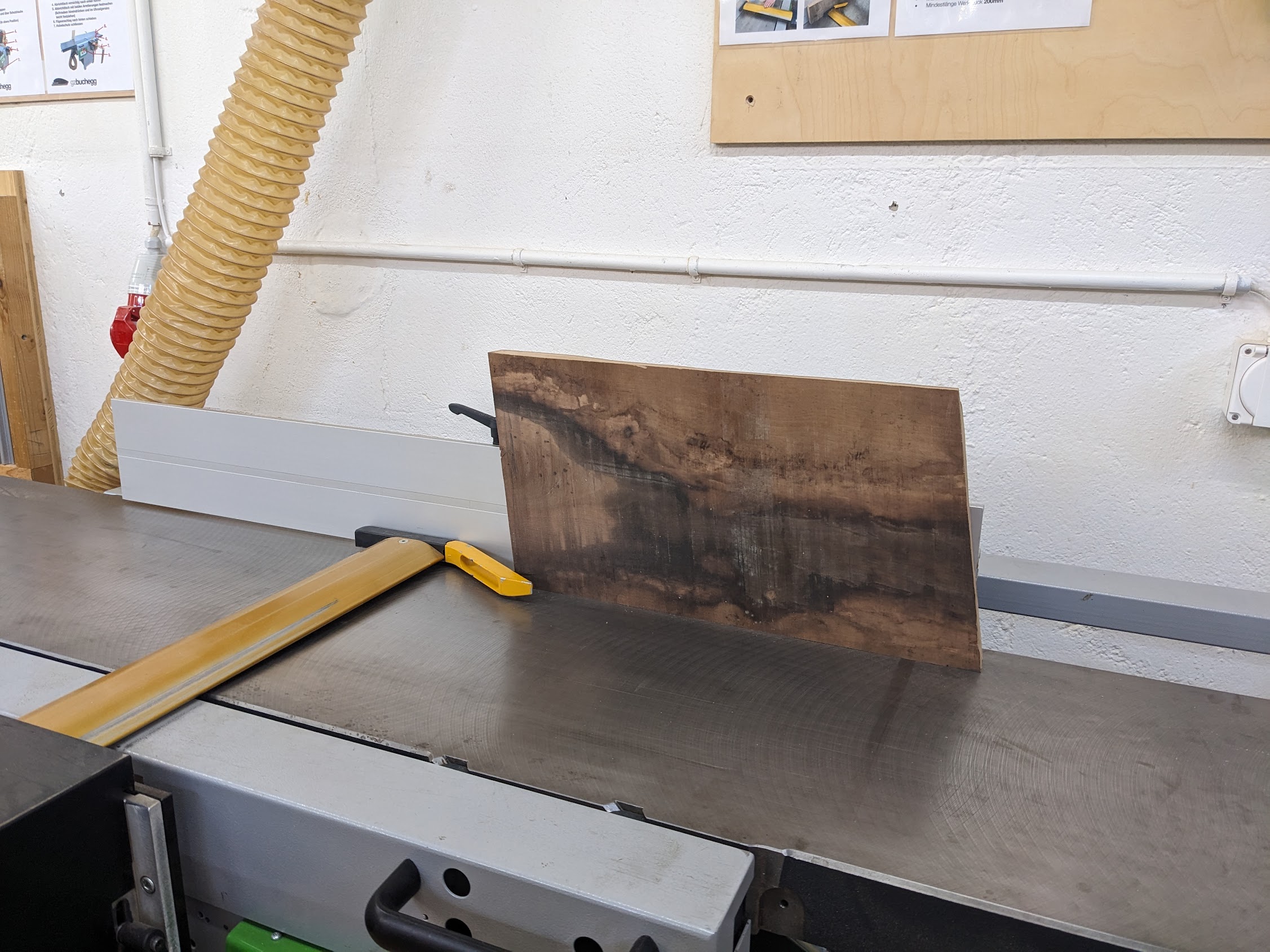 After choosing a long plank, the next step is cutting it to the size you want. To do this you use the table circular saw machine, which is the largest machine in the workshop. It’s also the first machine we learned about and there’s quite a few things to pay attention to: * Your hand must always be a hand-length away from the blade, even when turned off. Use a push block if necessary. There are special positions for your hand to hold the wood piece depending on what side of the machine you are. * Turn off the machine before touching/moving the piece you have cut. If it requires getting close to the blade, use a wooden stick/helper to move it. * What fence you use on the machine depends on the direction of the cut relative to the length of the board. If you’re doing a cross cut (i.e. a cut against the short axis) it’s one fence, but if it’s along the long axis, you use a different fence, called an angular stop. * The board must always be touching the fence (depending on the fence in at least two spots). This ensures the board is stable and doesn’t move while touching the saw. * The position of the saw blade depends on the kind of wood you are using. When starting with raw solid wood you want the saw on the upmost position. This reduces the risk of a kickback, as when the blade touches the wood the force is mostly downwards. For composite wood or solid wood that has already been worked on it’s ok to lower the saw. A lower saw makes a smoother cut. * Don’t stay in front of the blade when cutting wood. Instead stay to the side. This is to reduce the risk of getting hit by kickback. While this advice protects you, it doesn’t protect people working on machines in front of the blade 😅. * Always ensure whatever is being cut off has space to go/escape (i.e. make sure you are using the fence correctly, it shouldn’t block the wood piece being cut off from escaping after being cut; this makes sure there’s space between the wood and the blade after being cut). This again reduces the risk of kickback. * This circular saw in particular has a riving knife in the back of the blade. This ensures you can’t reverse an already cut piece into the back of the blade (this would throw the piece upwards!). * If your piece is not getting cut, do not force it into the blade, go back and push again. * Try to maintain a constant pace when going through the blade. Don’t take too long as otherwise you burn the wood on the side. * Once you are done using the machine hit the ‘emergency stop’ button. This button locks the machine from starting. This ensures people unfamiliar with the machine don’t know how to remove this lock and start it again.