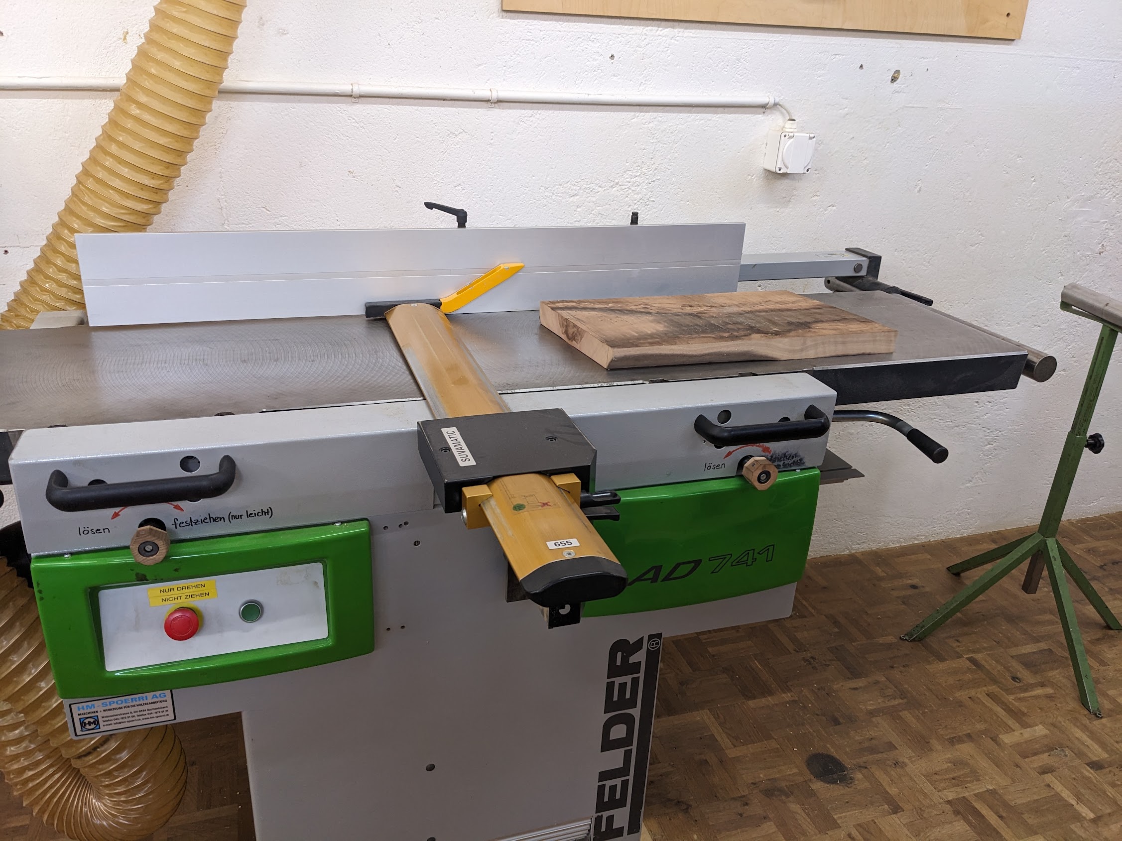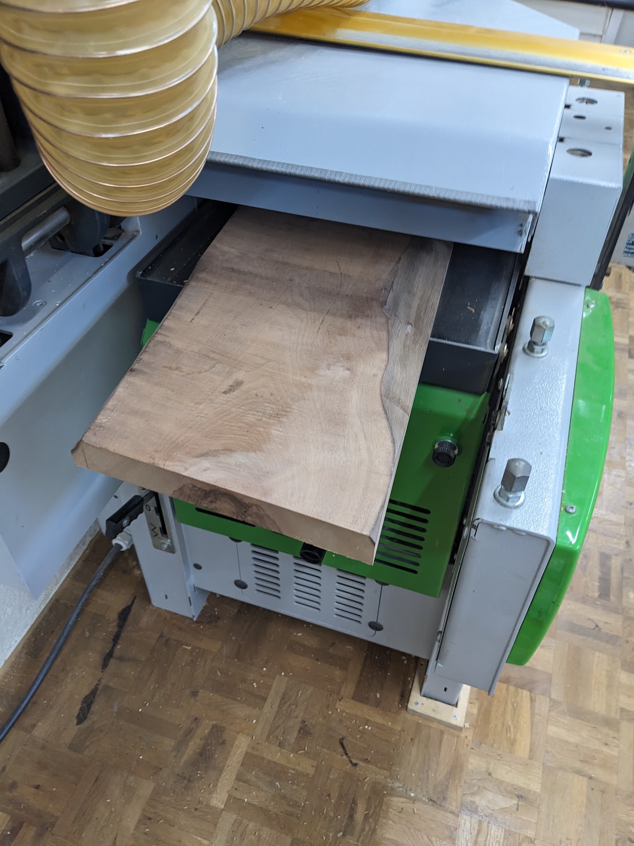 In the case of this workshop, it’s the same machine to make a surface flat and also to make a board the same depth everywhere. There’s instructions on the wall explaining how to configure the machine.